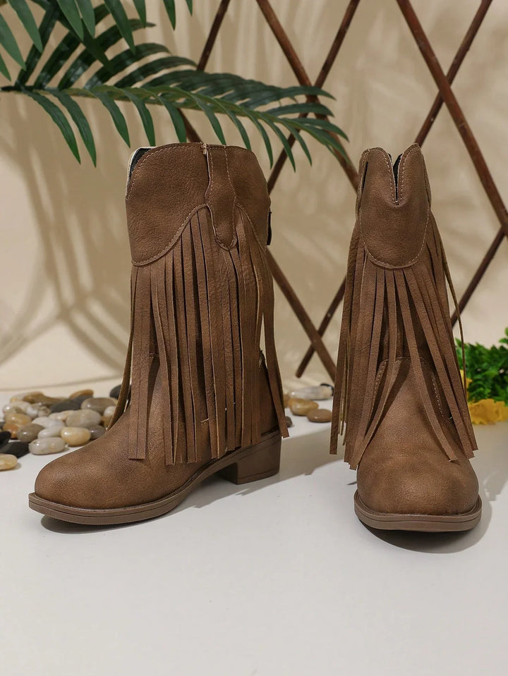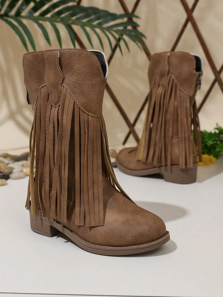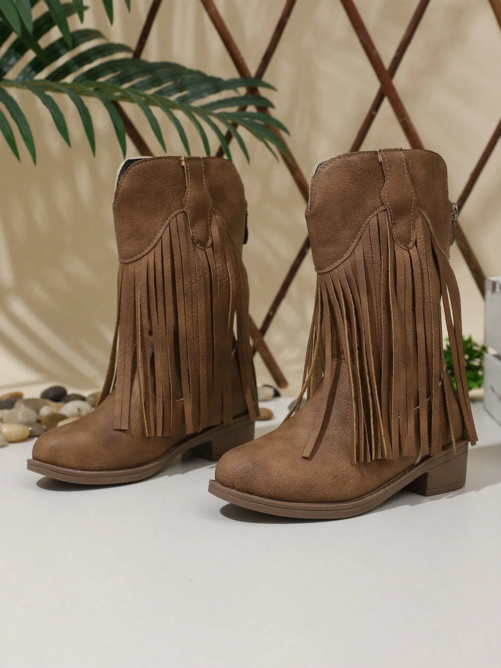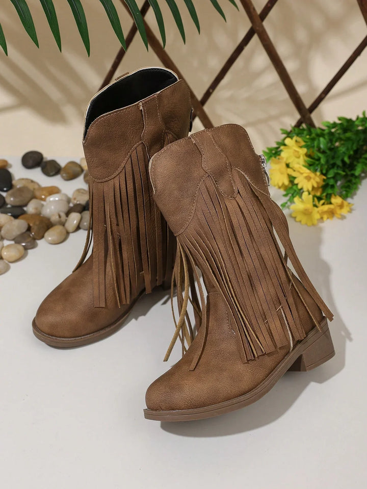 "2025 Autumn/Winter American Pioneer Children's Boots: Vegetable-Tanned Aged Leather + Anti-Drop Umbrella Rope Tassels; Side Zipper Ankle Guard Midcalf; 4-12 Years Old Farm Gift Box!"